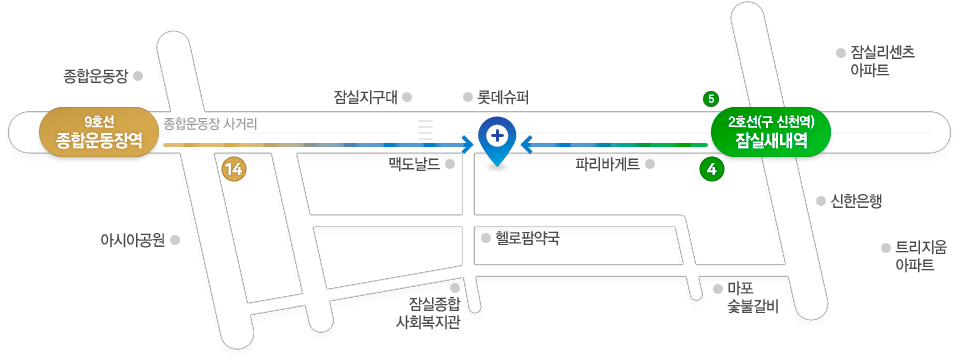 - 2호선 이용시, '잠실새내역' 4번 출구에서 종합운동장 방향으로 도보 2분(50m) 직진,